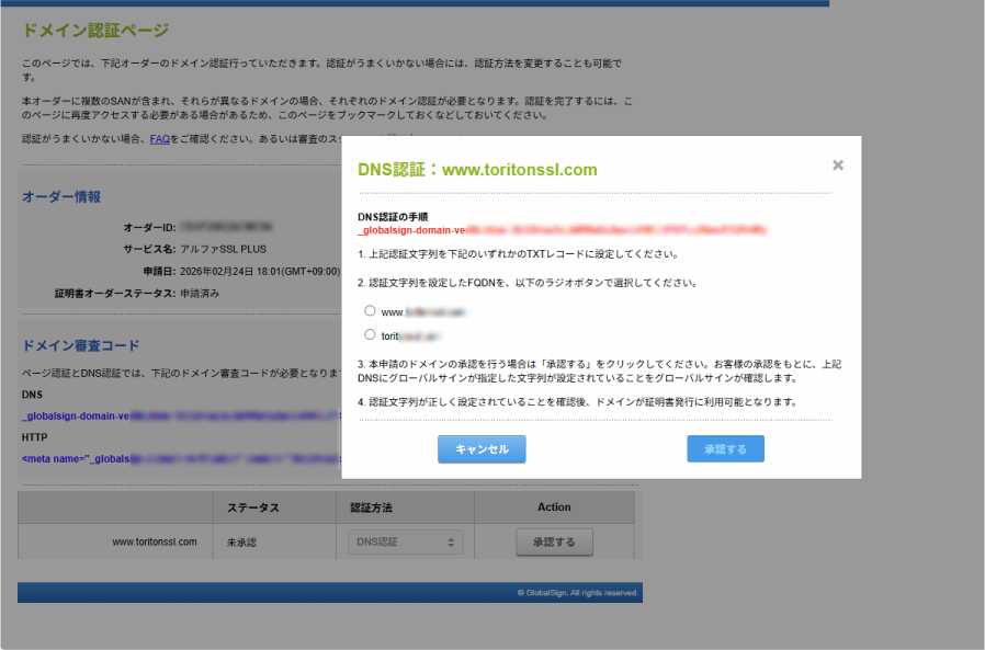 ※デュアルアクセス対応の証明書を発行するには、サブドメイン無しのドメイン名のみで認証する必要がございます。