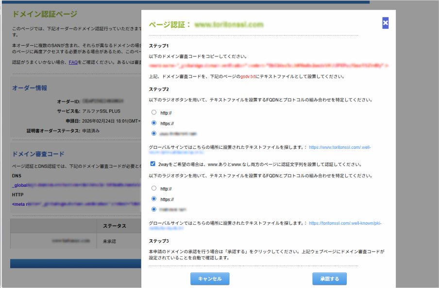 ページ認証を選択した場合の画像サンプル(www.ありとなしのドメインの認証を行う場合)